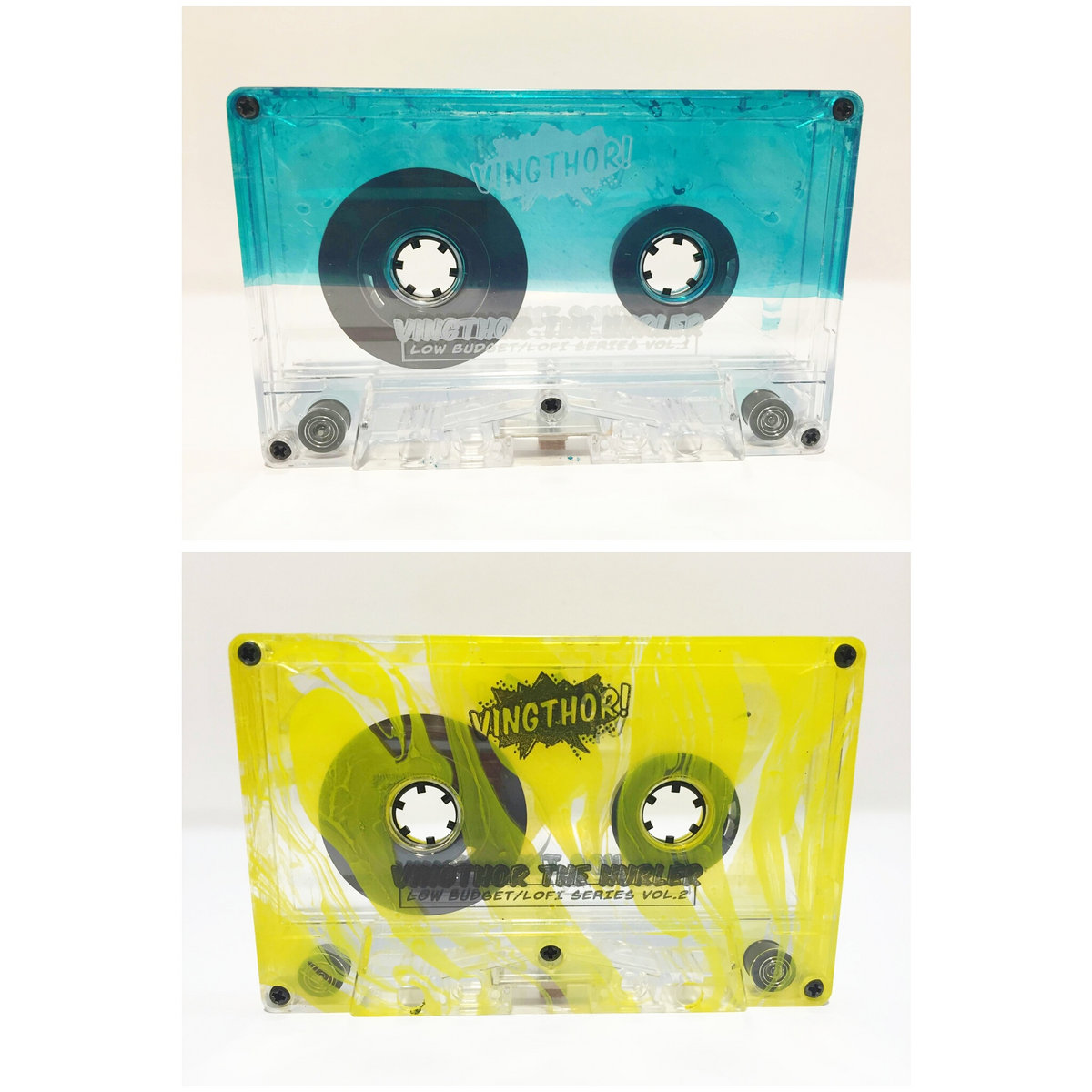 Beautiful 2 tone (turquoise/clear) and yellow swirl cassette shells with white imprint, full color J-card and clear Norelco box.